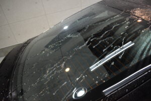 しっかりと下地処理を行いウロコ状になった水ジミや油膜を除去した上で、プロ用の撥水剤をたっぷり塗布していきます。